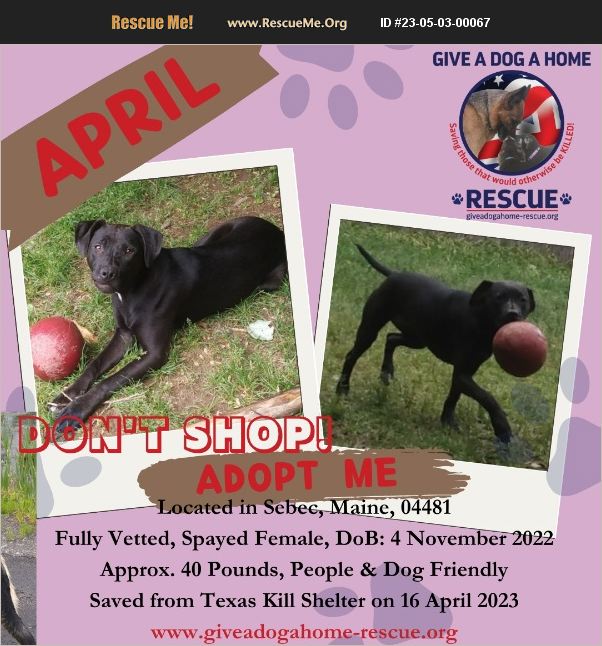APRIL was transferred to GaDaH from a high kill shelter in Texas on 22nd April 2023. We take a lot of pictures and videos and don't always have the time to post them on the dogs individual webpage and adoption site, so we ask that you go to the rescue YouTube channel and photo albums on our Facebook page to see a LOT of pictures and videos. APRIL is spayed, rabies, core vaccines, heartworm/tick tested negative. She is on monthly prevention, microchipped, has an estimated date of birth of 4 November 2022 and at the time of transport weighed 36 pounds. We have no way of knowing what the actual breed is, so it is up to people to look at the pictures and video's to make up their own mind. APRIL is available for adoption from Give a Dog a Home Rescue in Sebec, Maine for an adoption fee of $550. This adoption fee covers the cost of running a brick and mortar rescue as well as any transport, veterinary, food, treats, toys costs and the many expenses that rescues endure to keep the pets in their care safe, and happy. Be sure to read all the information and if interested, go to the rescue website to submit an adoption application. https://www.giveadogahome-rescue.org/forms/form?formid=5838 The rescue buys food in bulk, by the truck load and there are a variety of brands and flavors. None of the food given is less than a 4* food rating. There have not been issues with eating any of the varying foods. It is important that you do your research on the ingredients and speak to your vet or a nutritionist on grain vs grain free! �'��You MUST understand that dogs need time to decompress and adapt to their new environment and home. It is a HUGE transition they make from the kill shelter, being vetted, on transport for 3 days and arriving in Maine where the temperature and such is very different to what they have only known. In rescue there is what is known as the '3 Point Rule' Days 1-3 your dog is stressed, anxious, confused as to where they are now. Weeks 1-3 your dog is adjusting, settling in, learning things. At the 3-month point, your dog understands they are home, and have built up a trusting relationship where they feel loved and secure. If you feel that you have the heart and home to give this precious soul a wonderful life, please go to our website, under the ADOPTION INFO tab, complete, then submit the APPLICATION. Our process takes around 1-2 days, and ensuring your references are aware that we will be calling, could speed up the process. Once you have been approved, we discuss any questions in regards to the dog you are wanting to adopt, then we can schedule your appointment to come to the rescue in Sebec, Maine for meet/greet/adopt Please do NOT submit an application if you are not looking to take home a new best friend within the next few weeks. https://www.giveadogahome-rescue.org/forms/form?formid=5838 ALL Dogs are LOCATED AT THE RESCUE IN SEBEC, MAINE.
