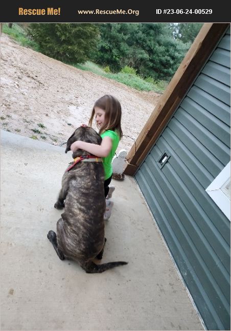 Luna is great with kids from 2 to 14. Adults in the immediate family she does well with. Zero food aggression or resource guarding. She knows many commands, very loyal and smart, low energy, on monthly heartworm/flea/tick preventative. She is 50%American Bulldog (mother ckc registered) and 50% English Mastiff(father akc registered)..She is approximately 90 pounds. Her birthdate is Jan.31,2022. The reason we are remhoming her...is due to the fact that she has a tendency towards territorial guarding behaviors. She intimidates new people who stop by with barking, jumping, and lunging. She has never bitten anyone. However, people who do not know her are often intimidated..our neighbors are relatives, and they do not like dogs and because of her guarding tactics it is causing relationship strain.