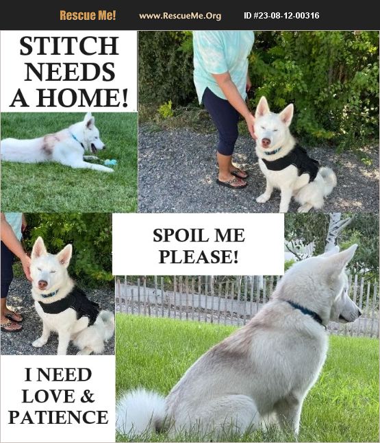 Stitch is a beautiful and energetic, pure Husky, about 9 months old. I rescued this pup and am housing him until we can find a permanent loving home. Stitch needs a home with a large yard and lots of play time, as he is very energetic, but very loving - and he gets along well larger dogs - but cats are very questionable, he likes to give chase to play. Because of the suspected abuse and neglect of this beautiful dog, we will be doing background and checking references prior to release to a new home. Stitch does listen to commands and tries to please, but at his young age, he needs someone to be patient and attentive to continue his basic behavior training. Stitch is located in Pleasant Grove Utah. You can call 801-427-5515 with any further questions.