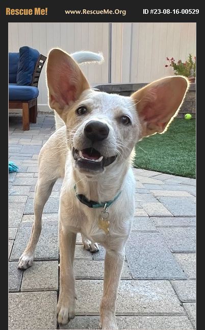What great ears! This striking gal is Ripley. She is a 4 months old Australian Cattledog mix who weighs 20 pounds and should be within breed standard when she is grown. Ripley is a smartie and knows all of her basic commands: Sit, Stay, Leave it, Come, and Lay down. She almost has roll over, too. She is crate trained and about 90% house trained (which is great given her age). Ripley is wonderful with adults and kids. She does sometimes get excited to jump up and say hi. She is learning instead sit and wait to be pet. She is also a typical herder pup in that she can be nippy. Ripley is good with other dogs and goes to daycare. She does like to play with dog friends. She is also good with cats. Ripley is good on leash and good in the car. She currently rides in a crate. Ripley is a fun girl. She has learned fetch (click on the red YouTube button to watch her fetch). She loves kisses and bringing a toy with her to chew while sitting in a lap. She would be an amazing running, hiking, camping adventure pal. Ripley is spayed, microchipped, and up to date on vaccinations. She is located in Poway, San Diego County. Adopters must be able to meet and adopt here. A home visit and vet reference are required to adopt.