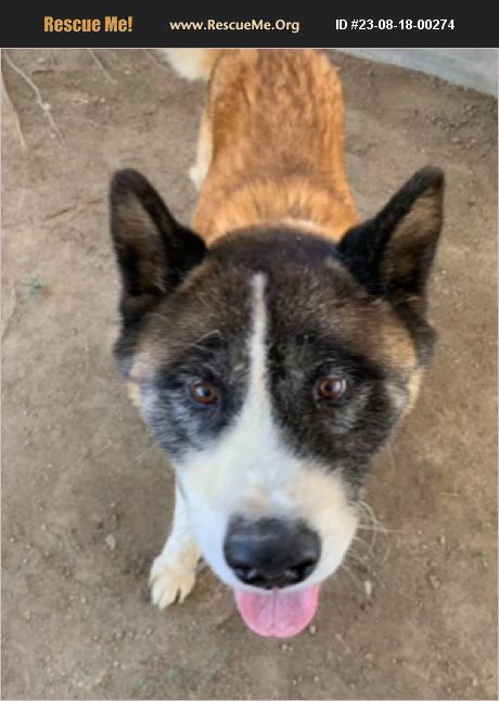 Poor Chase came in as a bonded pair at Riverside County Shelter. He was adopted separately, then was returned back to the shelter. The only information we have is that he was returned because he kept trying to 'get out/ escape'. We are under the impression that he was probably not accustomed to life without his older brother and was seeking companionship in his new home that he did not receive. He is at very high risk being back at the shelter. He is friendly and has sweet temperament, and deserves a loving home! If you are able to help in anyway possible, adopter, foster, transporter from Riverside county to San Diego County Valley Center, please contact us [email protected] Riverside County Animal Control - Riverside Shelter (951) 358-7387 [email protected]