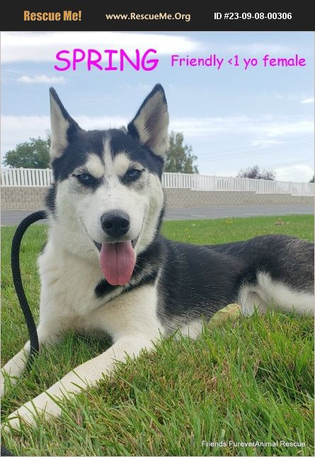 ***NEEDS FOSTER or FUREVER HOME*** Currently in Jerome boarding kennels This cute, petite, mellow and happy gal we named SPRING is ~1 year old and full-grown at (45 lbs. She would love to be your next furry family member! SPRING is dog-friendly and has been ignoring cats. She is a little uncertain with people who reach over her or too quickly, but is very loving if you approach her at her level. SPRING has blue eyes and half of one of her eyes is brown-pigmented giving her a unique look. Check out the photos to see her smile and the well-known husky looks when she is amused or entertained. SPRING does not bark but does have a beautiful woo-woo howl when she is with the dogs and can't see her human. SPRING does not seem to chew things up (e.g., not destructive with things in her kennel). She will likely need a bit of training for house habits. Volunteers have learned that she is very smart and treat-motivated. Her adoption fee is $225 and includes her health vaccines, spay surgery, rabies vaccine, health exam, and microchip. MORE PHOTOS: https://photos.app.goo.gl/DuciCfCmD9zGgcoY8 Complete an easy, online foster or adoption application to meet SPRING in Jerome. https://www.friendsfureveranimalrescue.com/adoption-application BACKGROUND: This young gal was living on her own south of Jerome and had to be trapped before rescue and a visit to the vet.