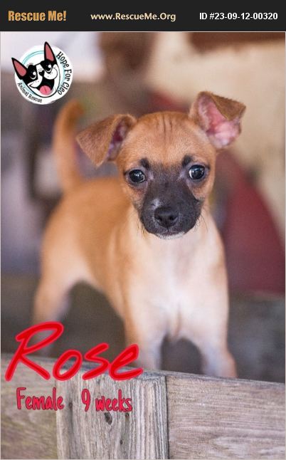 Meet Rose! This adorable 11-week-old female chihuahua mix puppy is ready to melt your heart and become the newest addition to your family. With its small size and cute button nose, this little furball is the perfect companion for anyone looking to bring some playfulness and love into their lives. This puppy is a rescue dog, waiting patiently for its furever home at Hope For Cleo Animal Rescue, eager to find someone who will shower it with affection and care. Rose is full of energy and ready to embark on countless adventures with you. Whether it's exploring the great outdoors or curling up on your lap for some snuggles, this little chihuahua mix will bring endless happiness to your life. Don't miss the chance to give this precious puppy a loving home. Visit www.HopeForCleo.com/adopt today and let this tiny bundle of joy capture your heart.