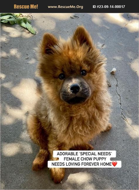 [Read About Natural Seizure Care] Please help us find a loving, forever home for this special needs sweet female chow puppy who is now approximately 15 weeks old. Yuan came into the Albuquerque shelter approximately one month ago as a stray, but is currently being fostered at a temporary foster home. Her foster tells us Yuan 'is very friendly and outgoing with people and dogs, loves to play, loves toys'. After it was noted she was having some tremors and ataxia though, 'she received extensive care and diagnostics in our clinic, and is generally healthy aside from the neurological issue. Our vets are pretty sure she has cerebellar hypoplasia (link below). All other tests have shown that she is normal and healthy. The shelter vet has stated, 'No ongoing medical treatment is expected, but if anything changes with her condition, adopters will be advised to follow up with their private veterinarian. The condition usually results in a wobbly gait, head tremors and/or exaggerated, clumsy movements. It does not get worse over time and there is no treatment for it, but dogs with cerebellar hypoplasia have normal personalities and intelligence and can make excellent pets to the right household. Adopters may need to make adjustments to the household to accommodate the disability. ' Her foster says 'She can walk and run very well, but does have the typical clumsiness, tremors, and frequent falls of her condition. She is almost completely housetrained. At this point the only special care she needs is to be kept in a space that doesn't include stairs or other obstacles that could lead to injury if she falls, and sometimes assistance eating. She is spayed, microchipped, and up-to-date on her vaccines. ' We have nice video of Yuan showing that she still gets around fine despite her special needs, and plays with other dogs on this link: September 6, 2023 - YouTube. As you can see, Yuan is completely adorable, and we are hoping to find a great home that understands the level of extra care she will need throughout her life, not just someone who falls for a cute puppy. Being also familiar with her breed is a plus. If you would like to learn more about Yuan and are considering opening up your home to this special needs, special girl who deserves to be loved, please contact [email protected] or Southern California Chow Chow Rescue Network who is assisting the shelter with her placement. She is adoptable with a medical waiver with the noted disclosure above of her condition, and the shelter would be happy to discuss her medical needs and daily routine as needed. Sarah at the shelter can also be reached at [email protected] for further information. For further information on cerebellar hypoplasia, please review the information found on this link: Cerebellar Hypoplasia in Dogs | Great Pet Care. Additional pictures, video and information can be found on facebook as we receive such at: https://www.facebook.com/783968124/posts/pfbid02zoyAQALodC6GdPFed8sfPnqD2oSYhwWbKBugmNg2qrVbLvPJrNx77PS5DcRgyJQPl/?mibextid=cr9u03 (please cut and paste links into your browser to view them)