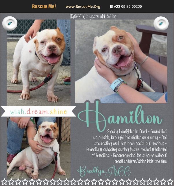 Available NY,NJ,CT,PA,DC,MD,DE,NH,RI,LI,MA,VT,ME Attention fans of the lowrider, blockhead chunks! We have an absolute hunky bear waiting on love! As hard as it is to believe, Hamilton was found tied to a fence and brought into the shelter. Excited and grateful to be saved, he greeted everyone at the shelter enthusiastically. He presents with a super soft body, huge smile and big, round, honest eyes. His video is completely adorable and showcases his incredible disposition. Hamilton obeys all shelter demands, and is an excited doggie. He is still young, and very playful. As usual the shelter finds fault with nearly every pet brought in, and so pouncing on Hamilton's excitement and zest. Staff describes him as friendly, soft bodied and cooperative. He seeks attention and sits down for petting. He even behaved awesomely during his medical exam. No resource guarding or aggression demonstrated. Appallingly the shelter placed him on the kill list instead of ensuring he finds a loving home. They see nothing wrong with destroying a sweet, healthy, young companion pet. If you are interested in saving this super cool and handsome boy, please message us now before it is too late for Hamilton. HAMILTON 182117 BROOKLYN ACC Estimated to be 5 years 1 week old, 57 Lbs UNALTERED MALE, MEDIUM MIXED BREED STRAY FROM NY MEDICAL BEHAVIOR EVALUATION: BEHAVIOR RATING: LEVEL 3 INTAKE DATE 09/11/2023 PET PROFILE Stray, no known history. Hamilton is white and tan male dog that was found tied up outside and was brought to ACC as a stray. During intake: he was friendly and outgoing. Due to his excitement I was not able to collar him but he did allow the staff to take his picture. Hamilton is in need of emergency placement due to behavioral concerns. While Hamilton has displayed some social behaviors, he has not acclimated well to the shelter environment. He has a high level of anxiety and a low threshold for arousal. Hamilton screeches in his kennel when he sees handlers and will leash bite when being removed from his kennel for walks. Once out of his kennel, Hamilton is unable to relax and remains in a heightened state of arousal and anxiety. Medically, Hamilton has been diagnosed with dental disease, has a small mass on the shoulder, and has hematuria. What my friends at ACC say about me: My history is a mystery and my friends here do not know much about me yet! It is unknown if I have ever lived with other animals or children. I have medical needs that staff will address with you when you meet me. I am playful and cute! I would do best in a home without very tiny humans, although I could be open to older human children once I meet them. I am looking for a home with a patient person. Please check here for updated adoption hours. ASSESSMENT NOTES Date of assessment:: 9/12/2023 Summary:: Leash Walking Strength and pulling: None Reactivity to humans: None Reactivity to dogs: Inconclusive Leash walking comments: Sociability Loose in room (15-20 seconds): Moderately Social Call over: Approaches with coaxing Sociability comments: panting, pacing, explores room Handling Soft handling: Accepts contact Exuberant handling: Accepts contact Handling comments: neutral body, panting, sits down for petting Arousal: Follows loose Arousal comments: follows with neutral body Knock: No response Knock Comments: Ignores Toy: Sniffs, Ignores Toy comments: No response Summary:: Due to operation limitations, dog-to-dog introductions are postponed. Summary (2):: 9/14: Hamilton was screeching at a handler when she was cleaning the kennel above him. 9/12/23: Hamilton is observed earlier in the day screaming at staff as they walk by. When the handler approaches to get Hamilton out, he is panting heavily but does not begin to vocalize. He begins to leash bite as the handler attempts to leash him, holding on for a few seconds before letting go. He does not respond to food or a squeaker. The handler is eventually able to leash him while he is drinking water. He is led to the canine behavior office for a handling assessment. Hamilton continues to pant heavily and the handler notes that his chest is slick with drool. He tolerates leashing and solicits contact from handlers. Hamilton tolerates the assessment and is returned to the kennel without issue. As soon as the door to the kennel is closed behind Hamilton he begins to scream again. Handler tosses a few treats that Hamilton ignores and walks away. Date of intake:: 9/11/2023 Summary:: friendly and outgoing, ENERGY LEVEL:: We have no history on Hamilton so we cannot be certain of her behavior in a home environment. However, she will need daily mental and physical activity to keep her engaged and exercised. We recommend long-lasting chews, food puzzles, and hide-and-seek games, in additional to physical exercise, to positively direct her energy and enthusiasm. BEHAVIOR DETERMINATION:: Level 3 Recommendations:: No children (under 13) Recommendations comments:: No children (under 13): Due to H