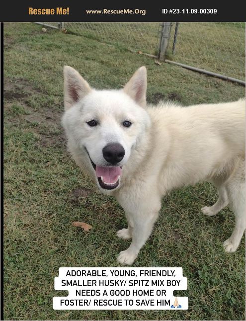Courtesy Posting: X URGENT PLEASE!! ADORABLE, YOUNG. FRIENDLY SMALLER HUSKY/SPITZ X BOY NEEDS A GOOD HOME OR FOSTER/ RESCUE TO SAVE HIM! WHO CAN HELP? BILLY - ID #230416 Ramona Shelter, San Jacinto (Riverside County Area), So Cal !!URGENT!! Please help us find a good home or foster and rescue for handsome Billy, a young and smaller white husky mix who finds himself in a crowded shelter now at risk. Billy was found by a good samaritan who brought him to the Ramona shelter in hopes of finding his owner. However, his owner never came for him, sadly. The finder told us this is a wonderful dog who is young, healthy and his teeth look good. They said he is very sweet and friendly, walks well on a leash, rode well in their car, although he was afraid to get initially in it and had to be picked up with no issues. Billy was very thin when found, and may have been dumped and wandering for a while. He now weighs 41 lbs. The finder has even offered to assist someone with transport or adoption costs if needed as they care about this dog and do not want to see him euthanized for space. At the shelter, Billy has had no issues, and while not tested yet one-on-one with another dog, he has been fine meeting other dogs through a fence, and could be tested upon request. We have a few additional pictures and video to share that we will also post here. If you are interested in adopting, please contact the Ramona Humane Society at (951) 654-8002 ASAP and ask for ID 230416, or by using this link: https://ramonapets.shelterbuddy.com/animal/animalDetails.asp?s=adoption&searchTypeId=4&animalType=3&datelostfoundmonth=10&datelostfoundday=31&datelostfoundyear=2023&tpage=4&find%2Dsubmitbtn=Find+Animals&pagesize=16&task=view&searchType=4&animalid=125937 or going to the shelter website: https://ramonapets.shelterbuddy.com/default.asp However, if you have interest in fostering, or any questions about Billy, please also contact [email protected] or Southern California Chow Chow Rescue Network who is trying to assist the shelter with his placement. Please see additional pictures, video and updates on his facebook page at: https://www.facebook.com/783968124/posts/pfbid0fpcov7iQR8h8DvKL1hj5DZg8yfX9D3odEJQgktxeTXJ1UAjFQcLK5nhYo2WJr7cvl/?mibextid=YHFMpa Note: to view contents of links, you will need to copy and paste each one separately into your browser.