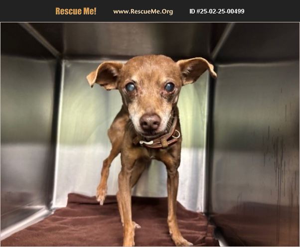 I am a brown and tan, small, unaltered female, who looks like a Miniature Pinscher mix. I am estimated to be 8 years old. I have been at the shelter since 02/25/2025. My review date is 03/01/2025. Please contact [email protected] for more information.