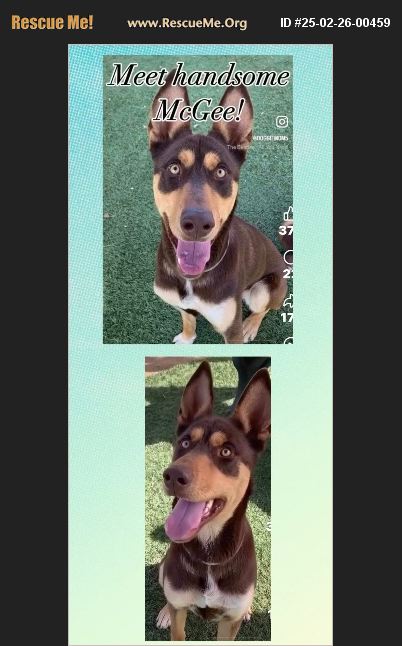 This very handsome boy is McGee!#A5677521 He is a 1 year old, 54.5 lb. Doberman Pinscher/Husky mix. He is stunning and has a cute curly tail too! He has plenty of puppy energy and is playful. He can be a little playfully mouthy and exuberant in play so could benefit from some obedience training. But he is worth the effort. He knows sit and loves treats. Walks ok on leash.Gets along with other large dogs. He would love an active family who could take him on adventures/hikes and give him plenty of attention and exercise. Video: https://www.facebook.com/reel/9265821116833181/?fs=e&mibextid=wwXIfr&fs=e You can meet him at Castaic Animal Care Center Mon-Sat from 11-5. 31044 N.Charlie Canyon Rd. Castaic, CA 91384