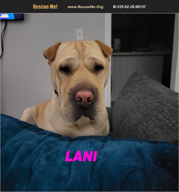 Lani is a sweet Shar-Pei mix. She is about 7 years old. She loves treats and running outside. She is 100% housebroken. She is allergic to fleas and sometimes needs her cute little wrinkles cleaned. She loves to give kisses! She is great with kids and other dogs, but isn't sure about cats, as she has never lived with one! We are looking for a loveable home for her as we are moving and are not able to keep her. It breaks our heart, but knowing she will be loved helps ease the hurt. Please contact me for more information.