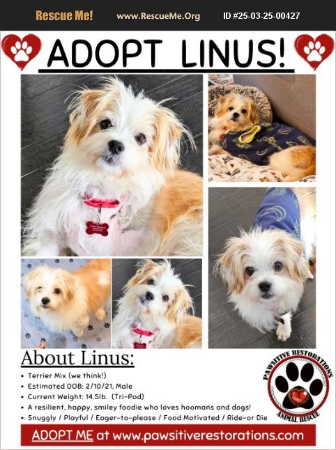 Meet Lil' Linus - our resilient little tri-pod heart-stealer with a head tilt that could melt glaciers! At around 4 years old and just 15 pounds, we believe Linus to be a small terrier mix with a big, beautiful soul. His long apricot-and-white coat is as soft as a cloud, and that button nose? Utterly irresistible! But the true magic of Linus lies in his spirit-this boy has been through the unimaginable and come out the other side with nothing but love and gratitude in his eyes. He KNOWS he's been saved, and he's grateful for every new day ahead of him! *** Go to www.pawsitiverestorations.com to learn all about our dogs, watch their silly videos, read our adoption process, and to submit an adoption application. Inquiries made on this site will not be seen! Visiting our website will answer all of your questions. Thank you! ��%90 ��%90%BE