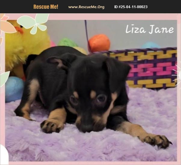 Liza Jane, Chi/MinPin mix, 10 weeks, 4 lbs, will be spayed last week of April. She is one of a litter of 7. Her mama was an owner surrender when she was late term pregnant and HW positive. Mom is around 14/15 lbs, we are told that dad is a Chihuahua. She was born and raised indoors and is potty pad trained and very social. She will be ready to go to her new home the first week of May. She will have 3 puppy shots, been wormed every two weeks, Bordetella, Rabies, Microchip, and be on HW/flea/tick preventatives. We require an application and a vet check for our adoptions. Transport is available to most northern states at the adopters expenses, but we will help to facilitate.