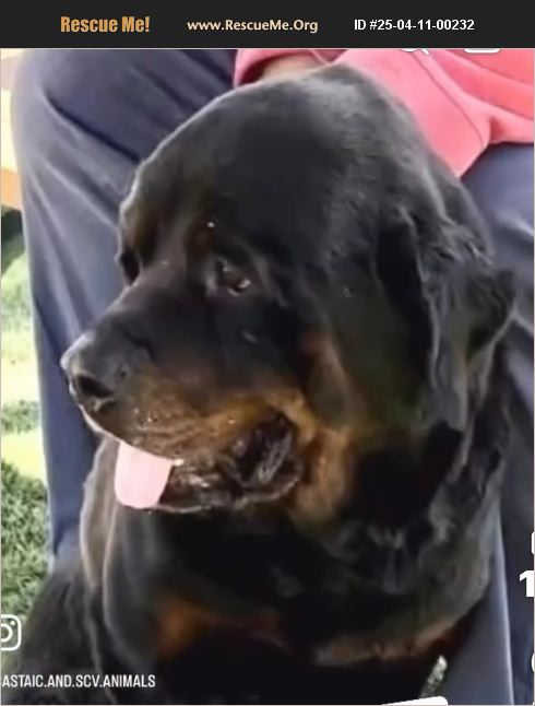 Senior Alert!! Meet Snogo, #A5457367, a handsome 8-year-old Rottweiler who came in as a stray, and now is looking for a loving home in which spend his golden years. Weighing in at 80 lbs, he's a big boy with an even bigger heart. He's got his basics down-he knows how to sit, takes treats gently, and walks like a pro on leash. He loves being around people and will happily lean in for pets and affection. Looking for an adult-only home with no other dogs. He will thrive as the only pet where he can soak up all the love and attention. If you're looking for a loyal, affectionate companion who still has plenty of pep in his step, this sweet Rottie could be your perfect match! Video: https://www.facebook.com/reel/1180937723136774/?fs=e&mibextid=wwXIfr&fs=e Snogo is waiting to meet you at Castaic Animal Care Center 31044 N Charlie Canyon Road Castaic CA 91384 Tel: 661-257-3191 Email: [email protected] Open Monday-Saturday 11-5 ( closed Sundays and holidays)