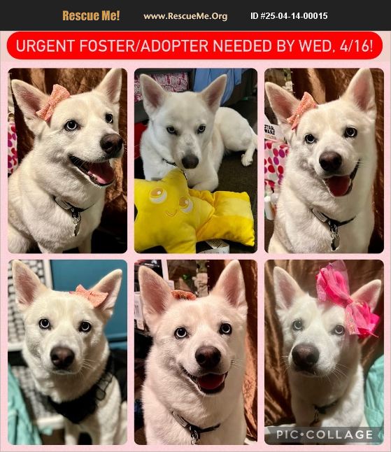 Tiana Needs an URGENT Foster or Forever Home by APRIL 16th or She is at Risk of Being Taken to the Kill Shelter!! This adorable 3-year-old mix of Siberian Husky and Korean Jindo is ready to steal your heart. With stunning blue eyes, beautiful white fur with a dash of black on her back, and a petite 25-pound frame, Tiana is as charming as she is loving. A Few Fun Facts About Tiana: Loves Food & Treats: She's all about those yummy snacks, especially when chicken is on the menu! Playful & Sweet: Always up for a game, she also adores belly rubs and giving kisses. Well-Mannered: Tiana knows how to sit, stay, and give her paw. Sleepy Head: She absolutely loves her naps and even knows when it's 'Go to bed/Bedtime.' Shower Buddy: Yes, she enjoys taking showers too! If you're looking for a loving companion who will brighten your days with playfulness and affection, Tiana is the perfect match! Interested in adopting or fostering Tiana? Contact Jennifer at Pumpkin Pawz Rescue at +1 (714) 366-8170. Text is best.�%A0 Please share Tiana's story on your social media. Let's find her the loving home she deserves!