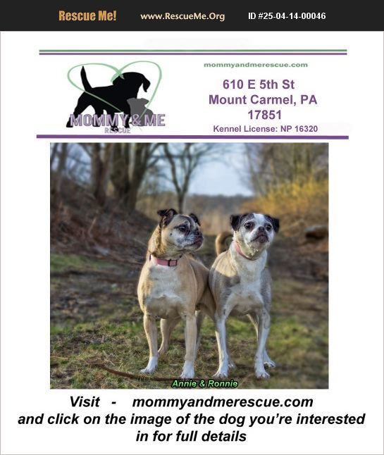 Please fill out an application here ) https://mommyandmerescue.com/adoption-application/ and give your vet clinic permission to speak with us. Spayed/Neutered, UTD on vaccines, Chipped Adoption fee 0 You must submit the application and be approved prior to meeting one of our dogs. If you have questions please EMAIL [email protected] or visit mommyandmerescue.com Kennel License: NP 16320 Ronnie & Annie Pug Mix Females AGE: 13 years Weight: 25lbs Ronnie and Annie are both healthy and have a lot of good years ahead of them. They just need a family to share those years with. Ronnie and Annie are friendly, sweet, outgoing, darling little girls who will steal your heart and love you unconditionally. They like other dogs and are good with kids, tho they do jump on little kids and may knock them over. We feel that they would do best in a quiet home with someone who is home a lot to give them the love and attention they deserve. Ronnie and Annie do like going for walks but they pull a bit. They love sitting outside with their person and enjoying the sun. They are crate-trained and house-trained. The adoption fee for Ronnie and Annie is covered, but you must submit the application and have great vet references to be considered to adopt them. We know the right family is out there that will love and adore Ronnie and Annie the way they deserve.