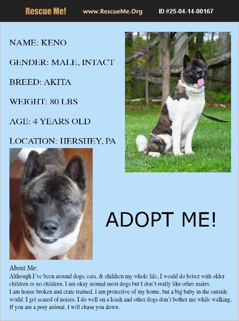 Keno is a 4.5 year old male, intact Akita. His owner lost their housing and has nowhere for the dog to go. All the shelters/rescues are full. No family is available to take this dog in. He has been around other dogs his entire life and has lost his pack. He is very anxious and confused as to what is happening. Keno would do better with adults and no children. He doesn't like other male dogs and will be dominate. He is a nice dog. House and crate trained. Would love to have someone to walk him daily. He is good on a leash and other dogs don't seem to steal his attention but a squirrel or bird is a different story. He will try to chase.If you can adopt this boy, it will save him from being humanely euthanized.