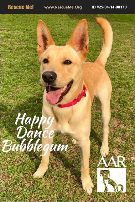 **Meet Happy Dance Bubblegum!** True to his joyful name, this lovable guy is full of charm, heart, and tail-wagging fun. He first showed up at a wedding venue, a little shy and unsure - but that didn't last long. With a hamburger as a peace offering, the kind owner won him over, and soon he was happily hopping into the car for a fresh start at our shelter. Since then, he's blossomed into a big, affectionate pup who adores love, playtime, and plenty of exercise. The volunteers can't get enough of him, and we know you'll feel the same! Est. DOB: 3/12/23 69 lbs. AAR does not transport for adoption.