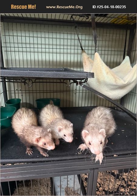 three ferrets, 2 girls 1 boy. all up to date on shots. very playful, likes to run around. wanting all three kept together to a nice welcoming home. my mom has a sickness and i don't have the time to keep up with their needs.