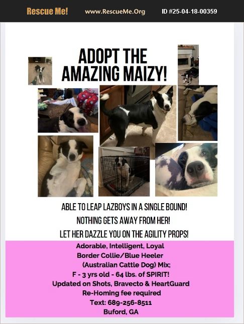 Betty loyal and protective dog. Sweet to her class. Maizy doesn't like young children and babies, or small pets. She would prefer to be an only dog but not lives with a male elder dog and gets along with lots of rough housing! Maizy's alpha daddy died suddenly making Maizy lonely for him but also extremely on guard for her surviving family. She nipped at a delivery driver who came to our door and was charged as a dog bite. If she bites again she will have to be euthanized in Gwinnett County. We are looking for a very seasoned dog owner to live the rest of her life with. She is a very smart, spunky, and sweet dog. Seems to like most women but she is skiddish of all strangers. So adoption may be done in stages. Maizy is very sporty and energetic enough for a very active person who'd like some company on their runs, a person to let her run and play every day. Maizy is not happy in the small apartment her family had to downsize to which is why we believe that more is the time for her new life with a blessed and lucky person to get Maizy as a wonderful loving dog. (Forgot to mention that she loves to lick you to death!) Rehoming fee applies.