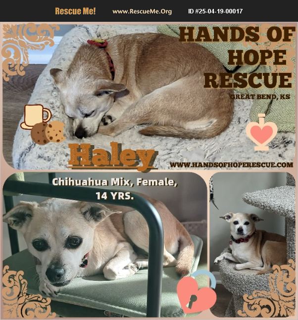 Meet the absolutely precious Haley. She is a 14 yr old Chihuahua mix who is as sweet as they come. Her owners left the country and did not take her or her brother with them. Haley is now ready to find a home that will love her for her remaining time on Earth. She is a healthy and happy girl and does great with her foster siblings. She woud love a lap to call her own and would be a wonderful addition to a calmer household. She is spayed, current on vaccinations and is heart worm negatative. Please fill out an application located at www.handsofhoperescue.com to adopt. HALEY'S ADOPTION FEE IS SPONSORED TO APPROVED ADOPTER!!�%A0