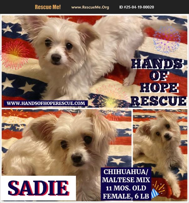 This little girl is a pip! Meet Sadie, an 11 mo. old female Chihuahua/Maltese mix who weighs in at about 5 1/2 lbs! Don't let her size fool you, she is not afraid of any dog bigger than her! She plays with other dogs and even the house cat! She is crate trained and pad trained most o the time and will go outside with all the other dogs in the home. When her foster mom was under the weather, she cuddled with her the whole time to make sure she felt okay! Sadie is current on vaccinations, spayed, microchipped, heart worm tested and kept on monthly preventatives. The first step is to apply on our website by filling out an online application at www.handsofhoperescue.com!