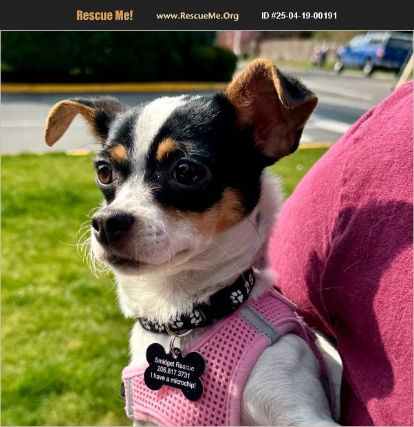 PLEASE READ THE ENTIRE BIO ON THIS DOG BEFORE REQUESTING AN APPLICATION. MANY OF OUR DOGS HAVE STRICT REQUIREMENTS FOR THEIR ADOPTION. 6-month-old female Chihuahua/Terrier mix, about 9 pounds. Happy, playful with dogs, a tad shy with humans. Does like to snuggle. Would love a fenced yard and a doggie playmate. Needs all the things puppies need: house training. leash walking, exposure and life skills. To request an adoption application, email [email protected] Adoption contract and fee applies. All adoptable dogs can be met at adoption events hosted every weekend. For a list of scheduled events go to: https://www.facebook.com/SmidgetRescue/events . Smidget Rescue is not a shelter, and dogs cannot be seen at the Rescue location. All dogs are fostered throughout the Puget Sound area and are brought to the events where they can be met by prospective adopters. Additional pictures of adoptable dogs can be seen at: https://www.facebook.com/SmidgetRescue/photos_stream?tab=photos_albums. All adoptable dogs are spayed or neutered at 6 months of age or older. Puppies are adopted with a refundable spay/neuter deposit (in addition to the adoption fee) and adopters are required to get their puppy to our vet for their pre-scheduled spay-neuter appointments. APPLICATIONS CAN BE OBTAINED BY EMAIL ONLY. Adoption process includes application, meet & greet, home visit and reference check. Email Jamie at [email protected] or click on the CONTACT link on this page. PLEASE DOUBLE CHECK YOUR EMAIL ADDRESS BEFORE SENDING. 8632781We get a fair number of incorrect emails and Jamie is not able to contact potential adopters. Notice: We do not ship dogs out of state. You must live within a three-hour radius of Seattle, WA, (such as Portland, Vancouver B.C., etc.), so we can arrange for a home visit. If your home seems like a great fit for the dog you would like to adopt, you must then drive to meet the dog at one of our weekend events or at the fosters home.