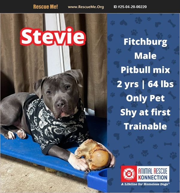 Meet Stevie! Could this young and handsome boy have taken Calcium supplements at one time? After being hit not by one, but two cars he walked away with just a broken tooth! He is one lucky boy and you can be just as fortunate by making him part of your family. Everyone appreciates Stevie's good energy level. He loves to go on walks and spend time with his person. He definitely bonds well, and you'll know you've stolen his heart once he snuggles up to you. He loves treats and is food-motivated, making him highly trainable. While he needs to learn some manners, he is just a really good boy who deserves a second chance. Please understand that Stevie has not been in a normal home situation for several months. Therefore, he will need his new family to take their time with him and let him acclimate to his new home slowly. From giving affection to doing zoomies, once Stevie warms up to you, he will show off his one-of-a-kind personality. 'And when he smiles for the camera, you know he'll love you better.' Stevie should be the only dog in your home, but down the road, with slow introductions, he may be able to live with a compatible playmate. No children or cats, either. He has been neutered and is up to date on his rabies vaccination. He has also been behaviorally evaluated. According to the report, Stevie is a very sweet boy who has low confidence because he's been through a lot in his short life. Though he can be nervous in new situations, calm and consistent love and training will help him realize the world isn't so scary. To set Stevie and his new family up for success, he will need a few visits, an overnight stay or two, and then progress to a full transition. We'd like nothing more than to see him welcomed into a loving home. Please apply at https://www.spotsplace.org/adopt Tell them Animal Rescue Konnection sent you!