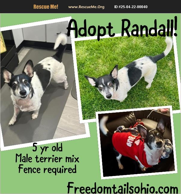 Adopt Randall! ��|� 5 years old ��|� Male ��|� Terrier mix ��|� 23 pounds ��|� Likes people and dogs (timid at first) ��|� Likes kids (timid at first) ��|� Not cat tested ��|� Fence not required if walked on a regular schedule Randall was scared of people at first, but not any more! He is a happy boy that loves to play fetch! Randall is not a fan of the crate, but will tolerate it for short periods of time. We are still working on potty training. Randall loves going on walks and would do great if you can walk him several times a day. Randall came with a skin issue (just in certain spots) that we're still working on. If you are interested in Randall becoming part of your family, please apply at freedomtailsohio.com.