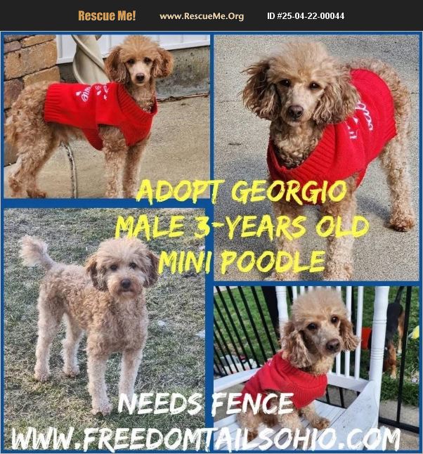 Adopt Giorgio Male Mini Poodle 3 years Needs another dog as a companion Needs fence Giorgio is 3 years old and abt 21lbs. He is a tall skinny poodle with an athletic body. Giorgio is a sweetheart but he is still a alittle fearful. He is hoping someone with a big heart will adopt him soon. He is ready for a family that is going to spoil him and help him continue healing. He has made so much progress since being rescued. He has a very playful side now! Giorgio can be skittish but he has come so far. He is curious abt the humans in the house, but hesitant to trust us completely. Giorgio's happiest times are running around the yard and playing with toys. Giorgio discovered he LOVES dog toys and enjoys it if you throw them for him to go get. He loves the other dogs in the house and they are a great source of comfort to him. Giorgio is going to need love and patience. Definitely needs a yard with a 6ft fence. He is not great on the leash yet. He is abt 95% potty trained. Would need to have atleast one additional dog in the house, but more is fine by him! Please submit an application if you would like to find out more into! He is not kid tested. Giorgio lets us hold him and pet him, but doesn't come up to us for pets yet. He does like to sit on the couch near us now. Sometimes he even sneaks into my bed at night. He is so very deserving of both love and security. Giorgio is fostered in Columbus. Please apply at www.freedomtailsohio.com