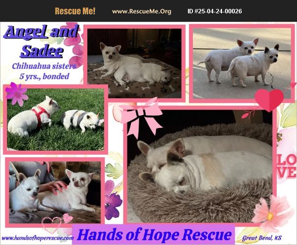 These girls are two peas in a pod! Meet Angel and Sadee, full Chihuahua sisters who are 5 yrs old and need a new family. They are bonded, sleep together, eat together and do everything together! They are so adorable and sweet to watch and love attentiion! They are a bit pudgy so on a diet, and very finicky eaters in true chihuahua form. They are not used to being held a lot but LOVE being by you or in your lap! They love going on walks too! They are fine with all their foster dog siblings, cats are unknown. They are doggy door trained but I do not have a doggy door so they go pee pads or out with the others go. They would be best with older kids since they are not used to being picked up a lot. These are sweet special girls and a home that loves this little breed! They just had dentals with NO teeth extractions and are spayed, current on all vaccinations, heart worm negative, microchipped and on monthly preventatives. The first step to adopting these two sweeties is to fill out an application on our website at www.handsofhoperescue.com!