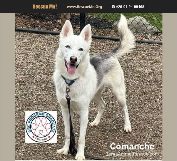 Comanche is available by consultant at Berea Animal Rescue in Columbia Station, Ohio. Please contact Kymber, Shelter Manager, at 440-506-3055. Meet Comanche! Comanche is a fun-loving, high-energy 2.5 year-old dog who has graduated from basic obedience! He has mastered commands like sit, down, stay, come, heel, and place. He's also potty trained and crate trained, making him ready to transition into a home. He absolutely loves to play and has gotten along well with every dog he's met. Fetch and tug-of-war are two of his favorite games! Comanche does have a high prey drive and enjoys chasing birds and rabbits, so he'll need a home that can manage his energy and instincts and no cats please. He would thrive with an experienced handler who can continue his training and help him acclimate to a new environment. If you're looking for an active, playful, and friendly companion, Comanche might be the perfect match!