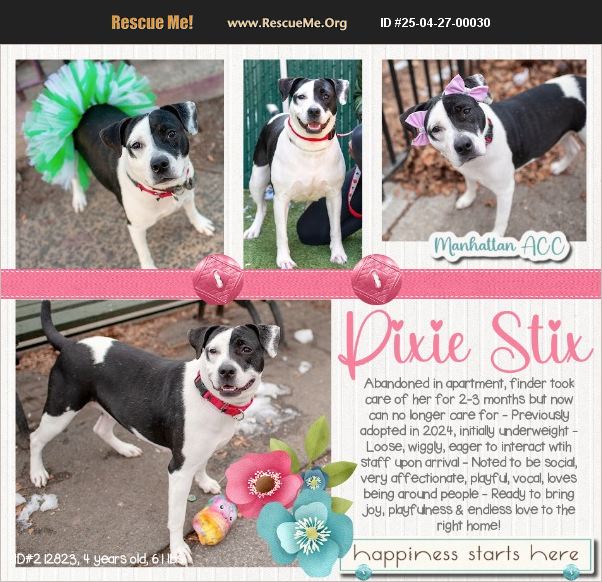 Pixie Stix has the kind of sweet, sparkling personality that could light up any room - but this beautiful 4-year-old girl is out of time and hoping against hope for her happily ever after. ���ӉϬ After being heartbreakingly abandoned in an apartment, a kind person took her in and gave her a soft place to land for a few months, but now Pixie's future hangs in the balance. She's found herself back at the shelter, tail still wagging, heart still wide open - but running out of chances. Pixie Stix is the total package: affectionate, social, playful, and full of love. She adores her people, loves to give kisses, snuggle up close, and can fill your days with laughter and your heart with so much joy. She's an active girl who would thrive in a home that enjoys walks, playtime, and adventures, as well as plenty of cozy couch cuddles after a fun-filled day. ��%90%BE��ե This gorgeous girl deserves more than a kennel and a countdown clock. She deserves her own human, a warm bed, belly rubs, and the kind of unconditional love only a family can give. Let Pixie Stix finally be the cherished companion she's always longed to be. ���� A heart like hers doesn't come around often - be her reason to believe in forever. ��%8F����� #PixieStixNeedsYou #AdoptDontShop #RescueDogLove #EuthListSurvivor #FosterOrAdopt #AdoptPixieStix ��%90%BE������%90� A shelter staff writes: Pixie Stix is a 4-year-old medium mixed breed with a heart as big as her energy! She was found as a stray and cared for by a kind finder for about three months before arriving at the shelter. Now, she's ready to find a forever home that will give her the love and structure she needs. PIXIE STIX@MANHATTAN ACC Pixie Stix ID#212823, 4 years old, 61 lbs Large Mixed Breed, White Unaltered Female Came into shelter as a Stray �'��Medical Behavior Evaluation: 1. Green Behavior Evaluation Rating: LEVEL 4 INTAKE DATE: 2/11/2025