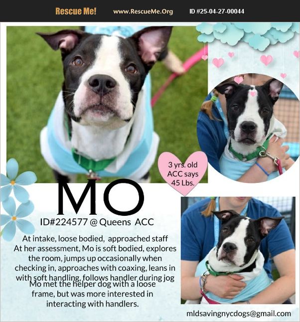 What a gentle, social pup Mo is! A Level 2 sweetheart, Mo came in as a stray but he had no jitters whatsoever entering the daunting shelter environment. There is no stranger in Mo's vocabulary, everyone is a friend. He is very food motivated, seeking treats all the time, perhaps he had gone hungry for some time. But this is a good thing, like most dogs that are food motivated, Mo can easily be trained. Mo is one of the many dogs given a deadline by the ACC. He needs a home ASAP as he sits on death row, waiting for his turn to be killed. ���� MO@QUEENS ACC Mo ID#224577, 3 years old, 45 lbs Medium Mixed Breed, White Unaltered Male Came into shelter as a Agency �'��Medical Behavior Evaluation: 2. Blue Behavior Evaluation Rating: LEVEL 2 INTAKE DATE: 4/14/2025