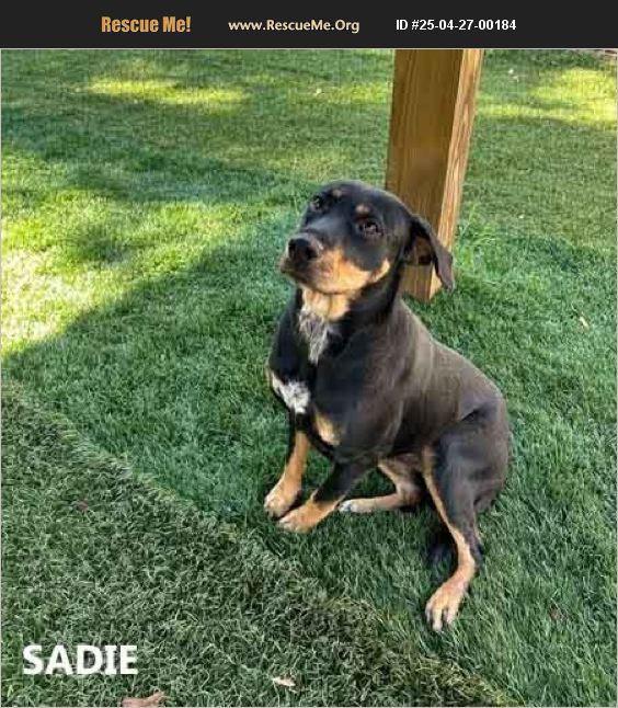 Sadie was found at our local McDonald's and brought to the shelter. She is a sweet girl, shy when she first meets you, but warms up quickly. She is roughly 45 lbs and 2-3 years old. She is a mixed breed, possibly Lab and her coloring could be Rottweiler or Black and Tan Coonhound. She is up on shots and heartworm negative, we will spay and ship her. She is active and likes to play, good with the other dogs and kids.