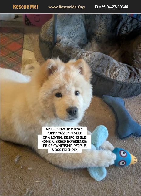 Courtesy Posting: LAS VEGAS, NV- MALE CHOW OR CHOW X PUPPY 'OZZIE' IN NEED OF A LOVING, RESPONSIBLE HOME W/ BREED EXPERIENCE/PRIOR OWNERSHIP, people and dog friendly Please help us find a loving, responsible home for adorable Ozzie, an approximate 5 month old puppy said to be born on 11/25/24. A Good Samaritan took him in and got him vaccinated and neutered after seeing him being given away, but wanting him to go to the right home. The person originally giving him away was older and said he did not have time for a puppy, but said he had gotten him from someone in Arizona, gave his birthdate, and said he was purebred with parents in the 50 lb range. However, it is possible Ozzie may be mixed given his black nose on a cream chow which is unusual, as well as slightly longer legs. Ozzie weighs 35 lbs already, so he may grow to be on the larger size, if his birthdate is correct. The Good Samaritan has now had Ozzie for about a month, and says, 'Ozzie is good with other dogs, very friendly with people. I don't have any small kids or cats, but he did see a couple cats while at the hospital and don't see any reaction.' She also reports he is 'Completely potty trained, does well in a crate ' and disclosed no medical or behavior issues. He is a home currently with other female and male dogs, and likes to play with one of the males. However, if you do have another pet, a meet and greet is strongly recommended. And any new dog in a home, and particularly as chow grows up, their personality with others and other dogs may also change, Early and continued socialization with both is important. If you are breed savvy and are interested in meeting and adopting Ozzie in person, please contact [email protected] or Southern California Chow Chow Rescue Network who is assisting with his placement. Sorry, we do not do transport to private homes unless a rescue is involved due to risks of a home or dog not working out for any reason. All adopters will be asked for a home check (which may be virtual), an application, a vet reference, proof of prior or current chows, and a signed adoption contract. We will be posting more pictures and any videos on him on facebook at: https://www.facebook.com/783968124/posts/10167006907678125/?mibextid=wwXIfr