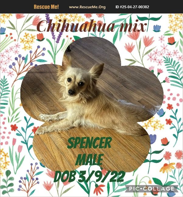 Spencer is a 2+ yr old, male, Chihuahua mix (possibly Pomeranian). He is a sweet boy and is so beautiful. He does well with other dogs (can be a little jealous of another dog getting affection). He will harass a cat. Would be fine with older kids.