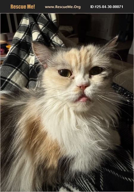 Maggie is a diluted calico Persian. I do not know if she's a purebred or not but she sure looks it. She's supper mellow. She Loves to be held on the couch and when you pick her up, she immediately starts purring. She was found on the streets of Cairo Egypt as a kitten. She was filthy and full of fleas. A kind woman took her in and cleaned her up and had her spayed. She is now in the US ready to find a Persian loving home. Very cool Cat.
