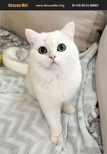 Description: We are looking to rehome our handsome Scottish Straight male cat, who is just shy of 2 years old. He has striking bright green eyes and a soft, white coat that makes him truly stand out. He has a loving, gentle personality-very affectionate, calm, and enjoys being close to people. He's the type of cat who will quietly follow you around and curl up beside you for company. He is litter trained, well-behaved, and has been raised in a clean, indoor environment. He would do best in a calm, caring home where he can receive lots of love and attention. We are asking a rehoming fee to ensure he goes to a responsible and committed home. If you're interested, please reach out with a brief description of the home you can provide.