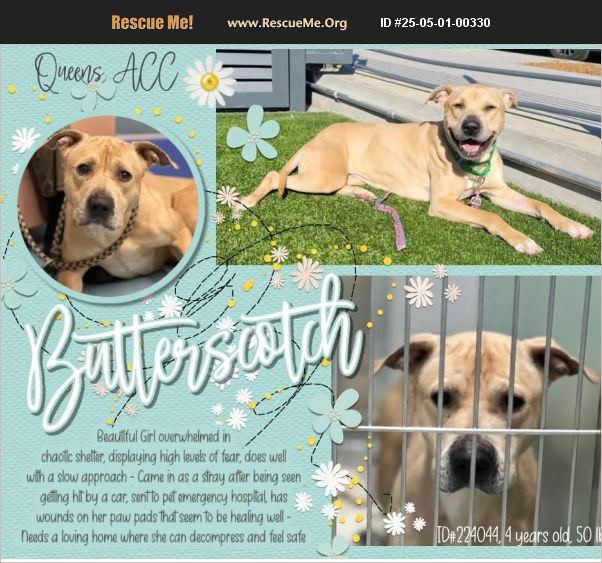 FINAL HOURS FOR SWEET BUTTERSCOTCH - A GENTLE SOUL WHO'S BEEN THROUGH TOO MUCH WILl BE EUTHANIZED SOON! There is a rescue intrested but needs a foster to pull to safety, shelter rules you cant pull a dog to put in boarding , must be a foster or adopter. I am praying that her angel shows up in time , she was issued the Euth command !! Butterscotch didn't deserve any of this. Hit by a car, rushed to an emergency vet, then sent to the shelter - only to now be facing the unthinkable: her final moments, alone and afraid. She's just 4 years old. Just 50 lbs. And she's run out of time. This timid, golden girl is as soft and sweet as her name. But life has not returned her kindness. What Butterscotch endured would break any spirit - yet somehow, she's still here, quietly waiting for someone to see her. After the accident, she was treated for wounds to her tender paw pads. But her emotional wounds run deeper. Now locked away in the loud, chaotic world of the shelter, Butterscotch presses herself into the back of her kennel, trembling, unsure if the next person will hurt or help her. She's not aggressive. She's afraid. And who could blame her? Still, even through the fear, Butterscotch offers small, heartbreaking glimpses of hope - a slow wag of her tail, a soft look when someone speaks gently to her, a calm demeanor when near another dog. She wants to trust. She just needs someone patient enough to show her how. What Butterscotch needs right now is not judgment. Not more time in a concrete cell. She needs safety. Compassion. A soft place to land. A home that will let her decompress, breathe, and believe that the world isn't only filled with pain. If you've ever loved a scared dog back to life, you know the transformation is nothing short of miraculous. Butterscotch can heal. She can become someone's beloved companion. But she needs her second chance now - before the shelter takes her last breath from her. Please don't let Butterscotch die scared and alone. Let her feel the warmth of a home, the comfort of love, the safety of a life worth living. She doesn't have more time. But she has you. BUTTERSCOTCH | ID#224044 | QUEENS ACC 4 Years Old | 50 lbs | Medium Mixed Breed Up to date on vaccines Microchipped Treated post-accident Shows gentle behavior with other dogs A calm, patient foster or adopter could be her miracle. Please give her a chance. Please text Kat 516 457-3678 if you can help