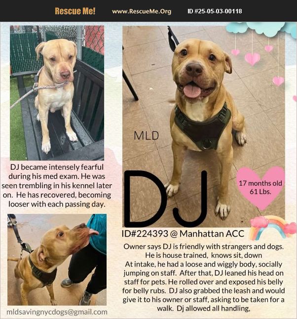 DJ 224393 MANHATTAN ACC Estimated to be 1 year 5 mos 2 weeks old, 61 Lbs. UNALTERED MALE, LARGE MIXED BREED OWNER SURR FROM NY, DOG HAS AN ALLERGY �'��MEDICAL BEHAVIOR EVALUATION: BEHAVIOR RATING: NH ONLY INTAKE DATE 04/25/2025