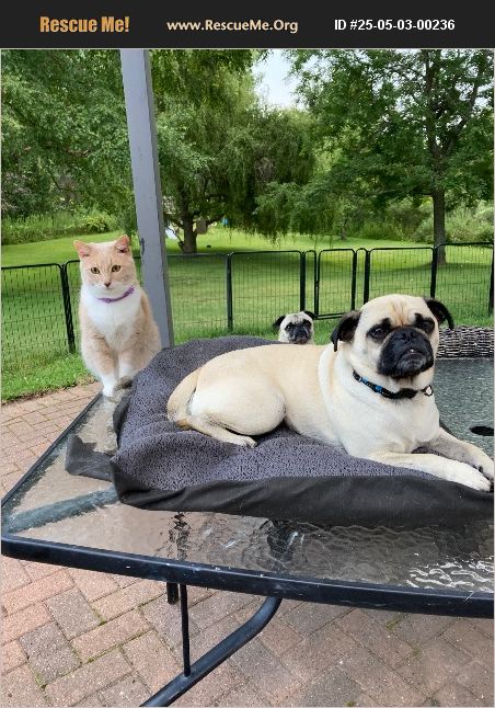 5 year old pug pure bred. Great with kids and other household animals. Was peeing in the house until we put him on anxiety medicine which really helped. He does have a tendency to chase cars so a fenced in yard would be good. We will ONLY let him go to a dedicated and loving home. We will be picky.