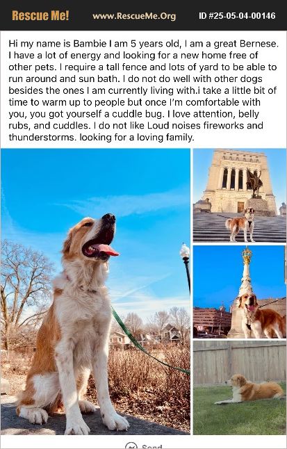 Hi my name is Bambie I am 5 years old, I am a great Bernese. I have a lot of energy and looking for a new home free of other pets. I require a tall fence and lots of yard to be able to run around and sun bath. I do not do well with other dogs besides the ones I am currently living with.i take a little bit of time to warm up to people but once I'm comfortable with you, you got yourself a cuddle bug. I love attention, belly rubs, and cuddles. I do not like Loud noises fireworks and thunderstorms. looking for a loving family.