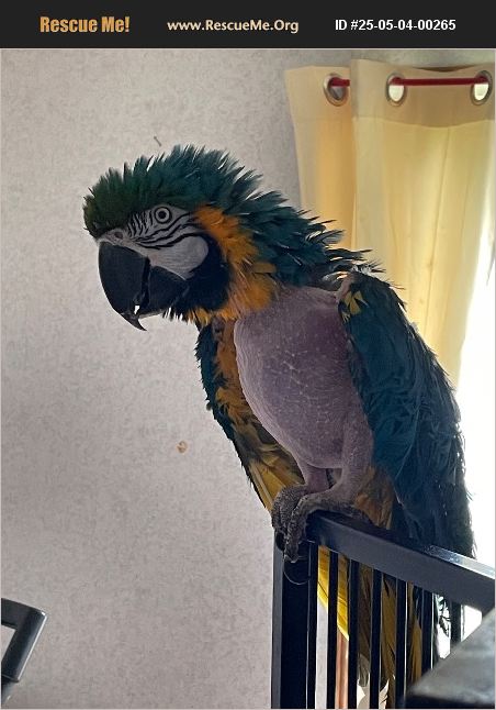 This animal is available to licensed rescue groups only. Please do not enquire unless with a licensed rescue group. I became Indigo's 3rd caregiver giver in 2010. She is now 37. She needs a big family and I work 12 hrs a day. Trouble finding someone to clip her claws. Very rural area, nearest Walmart is 40 min drive. She comes with a large cage, vhs movies and a tv/vcr player She says a few words and plays peek a boo Ready, cracker and whatever She has plucked out so many feathers from boredom.