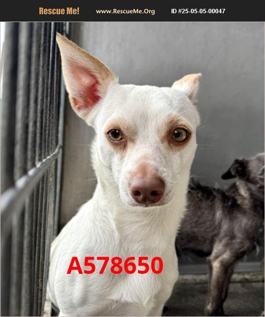 Name: Maximus Species: Dog Breed: Chihuahua - Smooth Coated Color: White Gender: Male Age: Approximately 1 year and 1 month old Description: I arrived at the San Bernardino City Animal Shelter on 04/22/2025 from San Bernardino. After my holding period ended on 04/26/2025, shelter staff gave me the name, Maximus. Current Location: San Bernardino City Animal Shelter, Kennel: 081