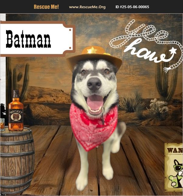 I AM THE BATMAN-LIKE, LITERALLY, I AM! Have you ever heard the saying, 'Good things come in small packages'? This applies to me! I am only 50 lbs, but I totally make up for that with my huge personality. I am only a year old, and I am looking for my new family. Do you like huskies? Look here because I am all husky, all the time. I even respond when you talk to me because we are good like that. I love to run and play-it's a puppy thing. I am good with people of all ages, including the little ones. We seem to get one another. My favorite part of the day is getting brushed. OMG, I love my brushies! It makes me tingle all over. I can also be your neighborhood watchdog, patrolling the streets while we look for pesky things that go bump in the night. But, ummmm, nothing too scary-I may be named after the Dark Knight, but, ummm, the only crime I am reporting is a lack of treatos! Right now, I am located in California, but I will travel to Naperville, Il for pick up for the right adopting family! So, if you are looking for a dog that will make you laugh and play with the kids, right here-I am right here! Please, no cats for me. I like to chase them. I don't hurt them; I just like to chase them! But I am neutered, up to date on everything, and ready to gooooo!