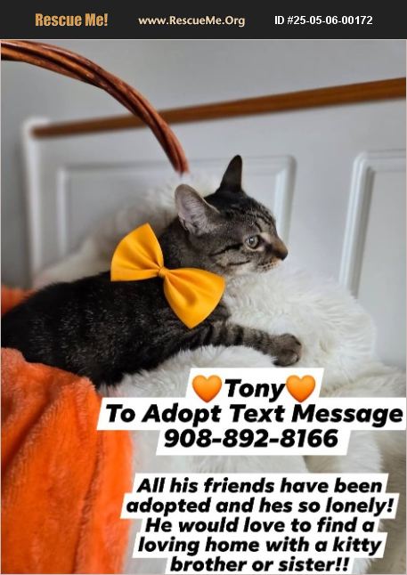URGENT!! SAVE TONY! TONY is an 8-month old brown tabby; while he can be shy with new people, he absolutely Loves other cats! Sadly, all of Tony's kitty friends have been adopted and he is so lonely! Tony needs a patient person who will go slow with him while he adjusts, and we hope to find Tony a home where he can have a kitty brother or sister to love! Tony now urgently needs an Adopter to Save Him! To Adopt please Text Message 908-892-8166