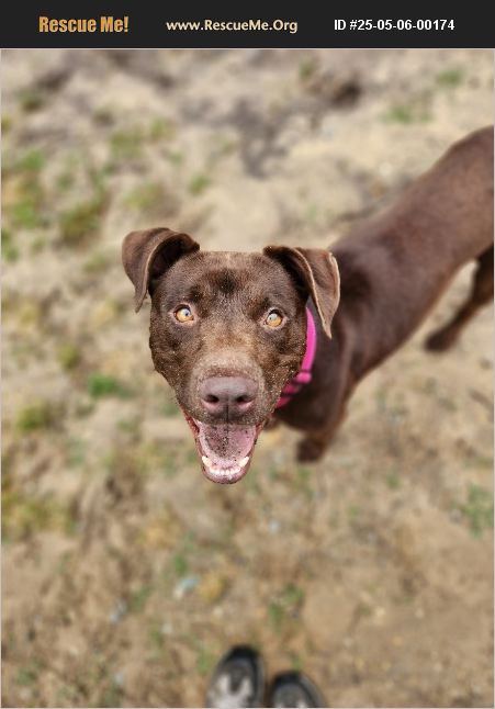 Chocolate Lab mix, estimated 3 years old! Lady is somehow the longest resident at a full shelter. She had to learn leash manners when she arrived at shelter but has been working with trainer and is much better. She is gorgeous, SMART, friendly with all, including kids she's met on walks! Dog friendly, seems housetrained! Typical lab- loves water, loves sniffing, loves fetch!! Adoption fees are $135, which includes up-to-date vaccines, microchip, and spay. I am a volunteer and have provided the shelter's phone number. Please attempt to call them first, but please feel free to use my e-mail (listed) if you have any troubles communicating with the shelter.