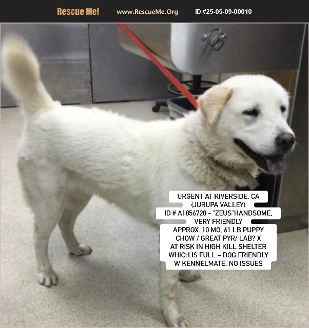 Courtesy posting: URGENT AT RIVERSIDE, CA (JURUPA VALLEY)- Riverside County Shelter, So Cal - ID #A1856728 - 'ZEUS'- A HANDSOME, VERY FRIENDLY approx. 10 mo, 61 lb PUPPY- CHOW / GREAT PYR/ LAB? X - AT RISK IN HIGH KILL SHELTER WHICH IS FULL - DOG FRIENDLY w Kennel mate, NO ISSUES HELP!!! STUNNING ZEUS IS AVAILABLE TO ADOPT, BUT SHELTER IS OVERFULL and EUTHANIZING YOUNG ADOPTABLE DOGS FOR MINOR REASONS SO THIS VERY YOUNG BOY IS AT RISK. WE ARE THEREFORE DESPERATELY LOOKING FOR A GOOD HOME, OR FOSTER AND RESCUE TO SAVE HIS LIFE. RESCUES NEED FOSTERS TO HELP! Friendly Zeus came into the shelter as an owner surrender through no fault of his own. Sadly, his owner was no longer able to care for him now that he is no longer a small puppy. He was reported as being 10 months old and a chow great pyr mix, although he looks a bit more lab to us. He is now 61 lbs so may get a little larger. Despite being dumped at a kill shelter, Zeus is seen in videos the shelter provided happily wagging his tail, and having no reported medical or behavior issues. He also gets along with his kennel mate (ID #A1854178) who is listed as a 1.5 year old male shepherd/malinois mix unrelated to him, but also needs a good home. If you are interested in adopting either dog together or separately, please contact the shelter immediately by calling (951) 358-7387 and reference the applicable ID and also use their listing link to express interest: https://24Petconnect.com/DetailsMain/RVSD/A1856728 The shepherd dog's listing is: https://24Petconnect.com/DetailsMain/RVSD/A1854178 If you are interested just to foster, or foster to adopt, or if you need further help, please contact [email protected] or Southern California Chow Chow Rescue Network asap as we are trying to find fosters we can then refer to a rescue group to save her/them in time. If you are a rescue group and interested in pulling this stunner, please email the shelter right away at: [email protected] and call (951) 358-7302. Zeus will be neutered for a home. We will be posting any additional information, pictures and videos on facebook at: https://www.facebook.com/783968124/posts/10167056663063125/?mibextid=wwXIfr NOTE: to view contents of links you will need to copy and paste each link separately into your browser.