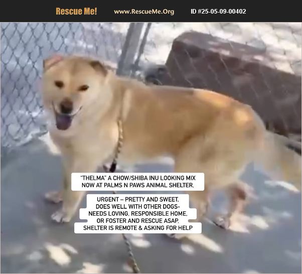 Courtesy Posting: TWENTY NINE PALMS, CA (IN SAN BERNARDINO COUNTY/S CAL)- 'THELMA' a chow/shiba inu looking mix now at Palms N Paws Animal Shelter, the municipal shelters serving Twentynine Palms and the local marine base. URGENT - PRETTY AND SWEET, DOES WELL WITH OTHER DOGS- NEEDS LOVING, RESPONSIBLE HOME, OR FOSTER AND RESCUE ASAP, SHELTER IS REMOTE AND ASKING FOR HELP Please help us find a loving forever home, or foster and rescue, for this dear girl who was found roaming at a local marine base. She was microchipped, but when her owner was contacted, the owner said she was no longer in the area and had rehomed her to another family. That family would not return calls. However, they learned Thelma lived with a 10 year old female pitbull who she was found abandoned with, but unfortunately, Thelma's companion became sick in the shelter and was humanely euthanized. So now Thelma is without her friend, and needs a home or rescue asap so she does not live out her final days in a lonely kennel. The shelter describes Thelma as 'a chow chow mix with a heart full of love. Her nature is as sweet as honey and she's as loyal as they come. Thelma is an adult dog who is already spayed, making her ready to become a new family member without delay. She's a social butterfly with new dogs, always ready to make a friend. She's the kind of dog who will greet you with a wagging tail and lots of affection. ' The shelter volunteer who reached out to us also told us, 'Thelma knows her name, appeared to be potty trained from the reports of the finder who held on to her for a few days while trying to contact her owners. She has been sweet with volunteers and staff, but will be hard to place in the community because her breed is restricted on the marine base. She has the very stereotypical blue tongue of a chow chow, but is right between the size of a shiba and a chow (~50lbs).' The chip owner reported her to be a chow shiba inu and 5 years old. If you are interested to adopt this deserving girl in person, please contact the shelter at 760-367-6799 ext 3 Tuesday -Friday 12-5, Saturday 11am-2pm. If you can possibly foster for a rescue, please contact [email protected] or Southern California Chow Chow Rescue Network asap who can try to pair fosters with a willing rescue group. If you are a rescue and can help, please contact the shelter directly. We will be posting updates, more pictures and videos on Thelma's facebook page at: https://www.facebook.com/783968124/posts/10167060083683125/?mibextid=wwXIfr Note: to view contents of link you will need to copy and paste it into your browser.