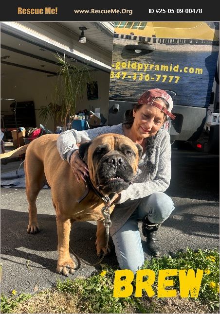 Brew is 7 yrs old, about 175lbs. He is in good health besides itchy paws and ears. His owner passed away and he needs a new loving home. He still tries to play like a puppy but also loves his sleep. Loves walks. Great with people and most dogs. Eats and drinks with no problem. Most of all, he loves attention