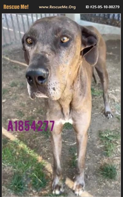 Name: Kori Located At: Riverside County Animal Control - Riverside Shelter Description: I am a female, 109.30 lbs, gray and white Great Dane. Age: The shelter staff think I am about 5 years old. More Info: I have been at the shelter since Apr 22, 2025.
